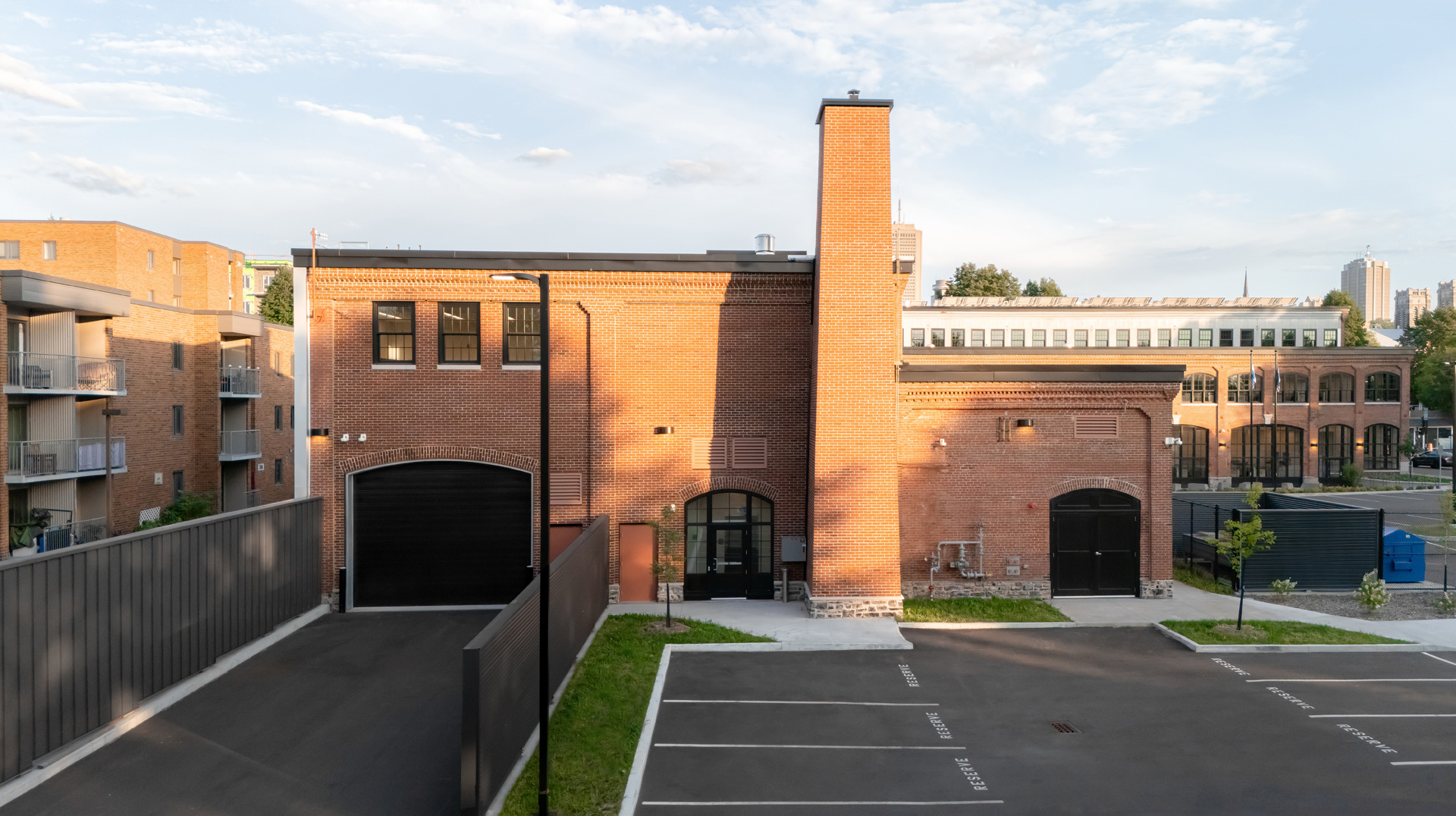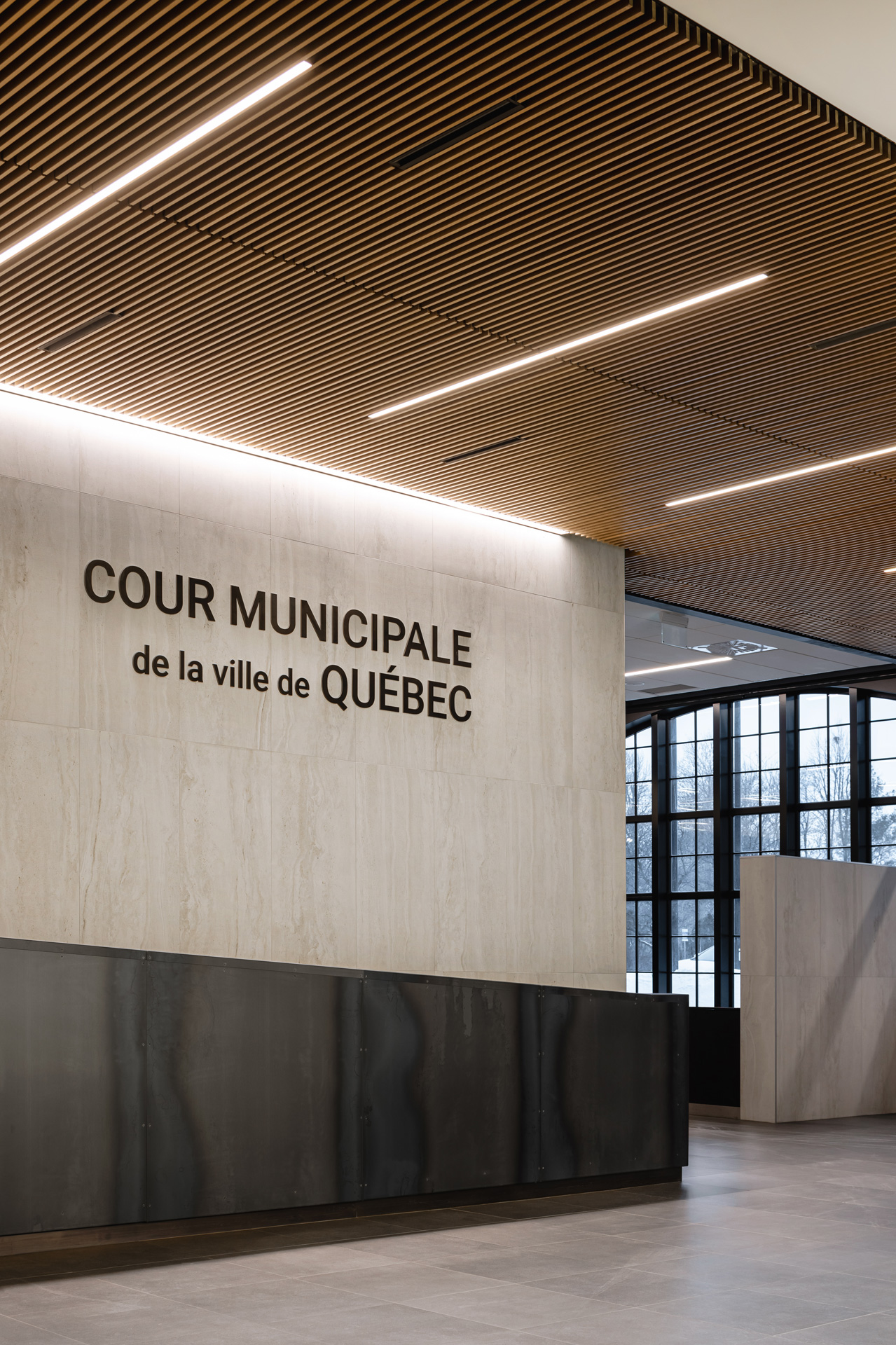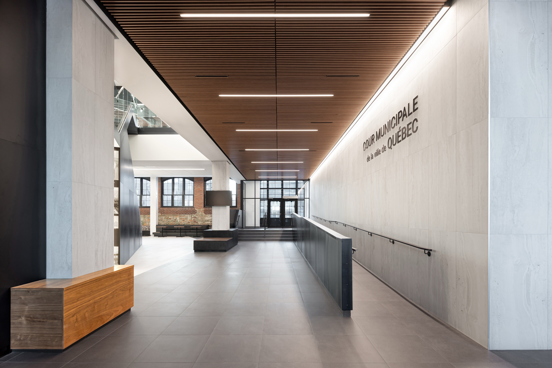La réhabilitation du bâtiment F.X. Drolet constitue une intervention architecturale audacieuse, célébrant le patrimoine bâti de Québec tout en répondant aux besoins actuels de la communauté. Situé dans le quartier historique de Saint-Roch, cet édifice industriel de 1908 a été méticuleusement restauré et transformé pour accueillir la Cour municipale de Québec et un point de service du Service de police de la Ville de Québec (SPVQ). Les façades en briques rouges et les détails ornementaux d’origine ont été sublimés grâce à une restauration rigoureuse, mettant en valeur l’authenticité matérielle du lieu. À l’intérieur, les murs en briques apparentes et les grandes ouvertures renforcent une esthétique chaleureuse et lumineuse.