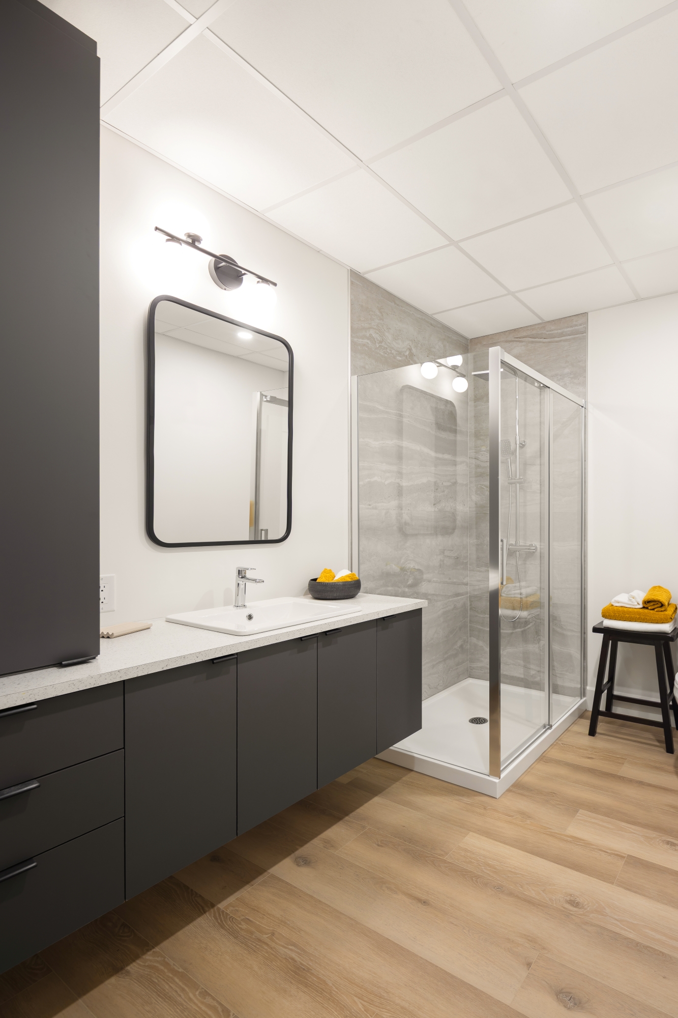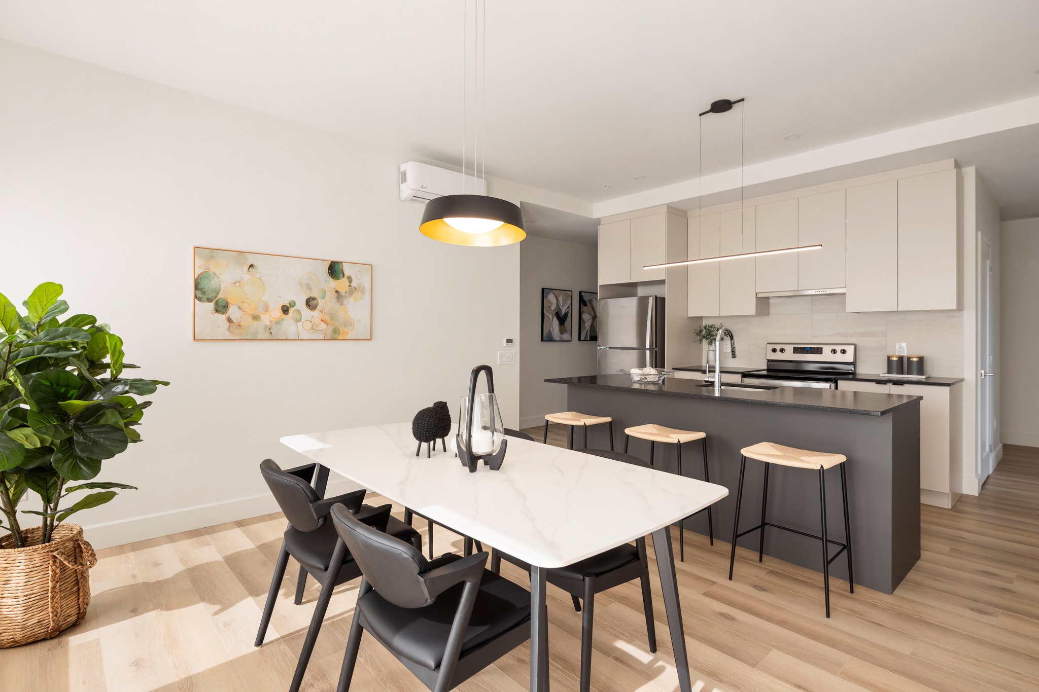 Les unités spacieuses et soigneusement aménagées bénéficient d’une conception haut de gamme avec des comptoirs en quartz ou granite, des dosserets en céramique tendance et des hottes rétractables qui ajoutent une touche d’élégance aux cuisines. L’accent est mis sur la qualité des finitions et la durabilité des matériaux.